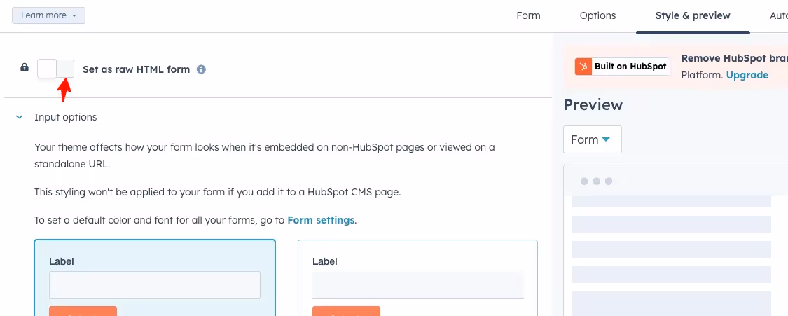 Embedding HubSpot forms and styling them with Webflow is a popular method to ensure design consistency and maintain advanced HubSpot features. The key is to select the option for “Raw HTML” in hubspot. This is a paid feature and requires the Marketing Hub Starter.