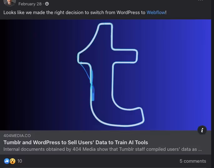 As we await AI advancements in Webflow, it's reassuring to have transitioned from WordPress, especially given recent privacy concerns. Reports that Tumblr and WordPress are selling user data to train AI tools underscore the importance of our decision to switch platforms. While AI integration in Webflow remains uncertain, avoiding the privacy issues associated with WordPress strengthens our choice. Security and stability are paramount, and Webflow appears to offer a more secure environment compared to its competitors.